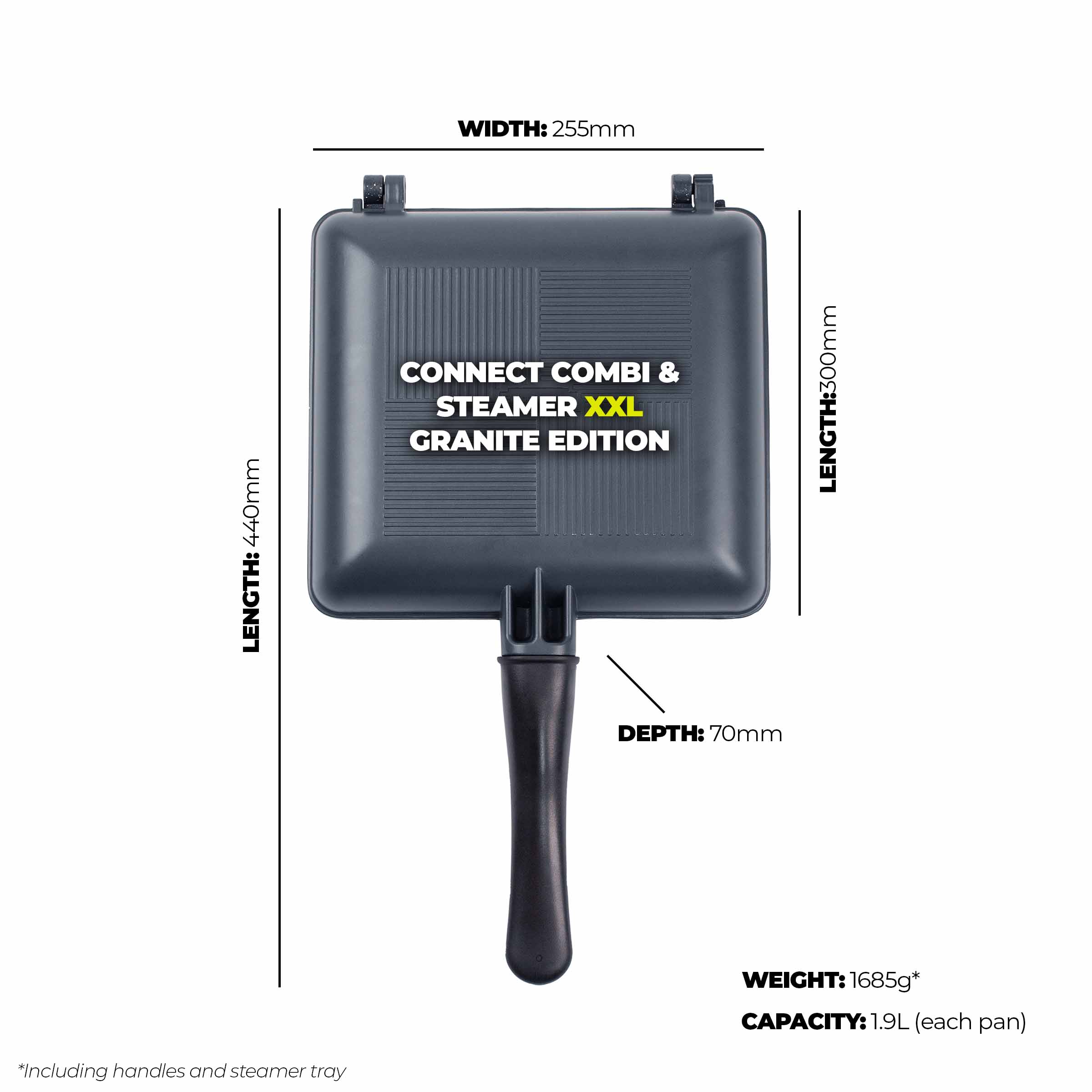 440 мм x 255 мм x 70 мм (включая ручки) / 300 мм x 255 мм x 70 мм (без ручек) / 1685 г (включая ручки и вкладыш) / 835 г (1.4 л - сковорода с секциями) / 665 г (1.7 л - сковорода)