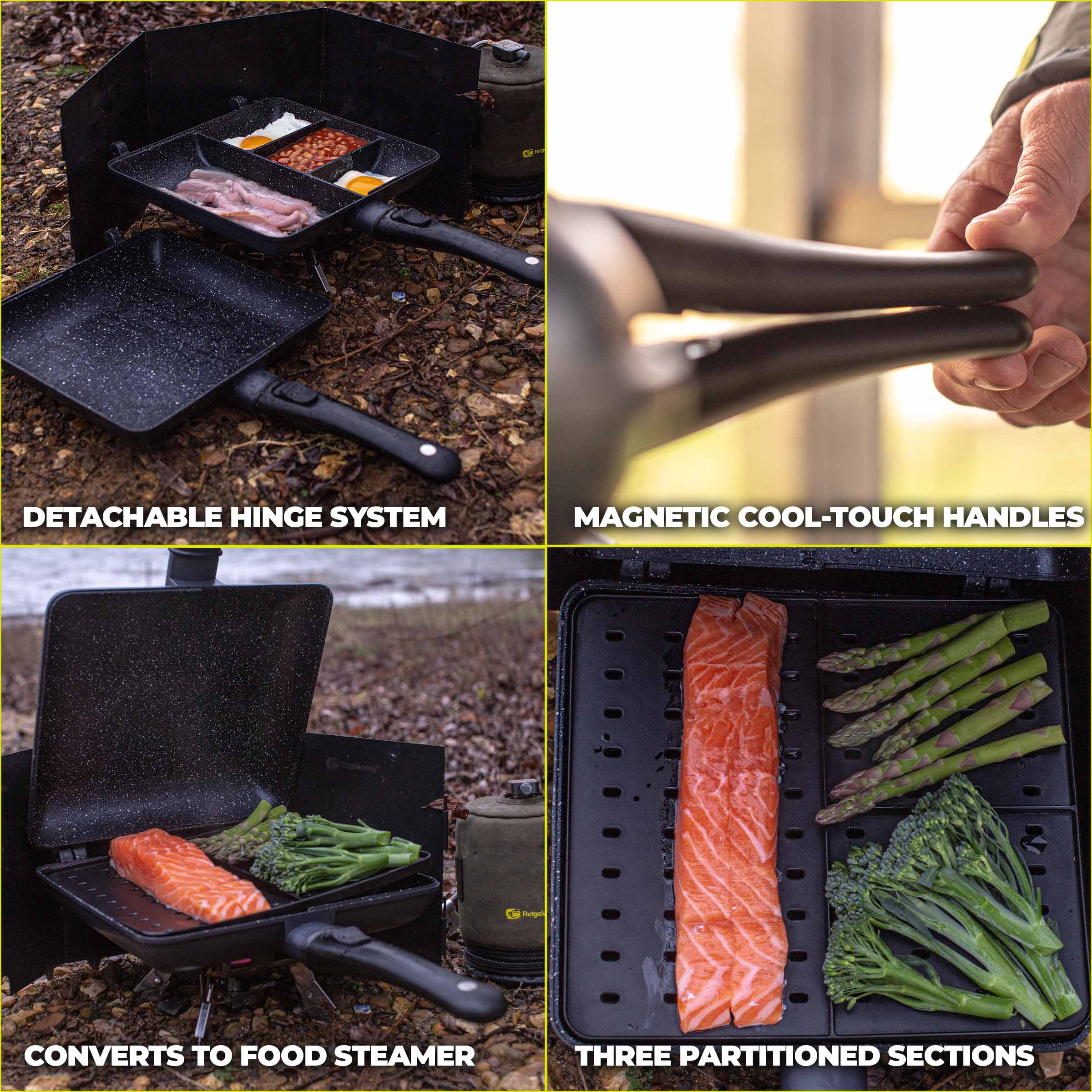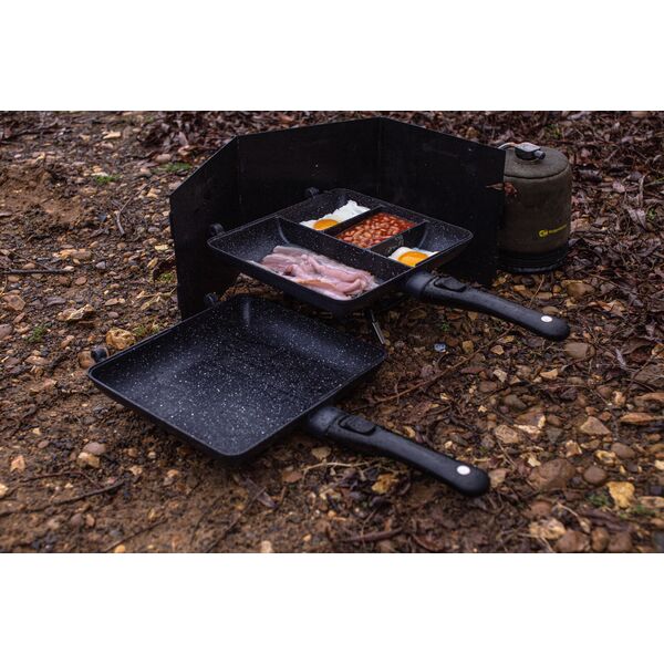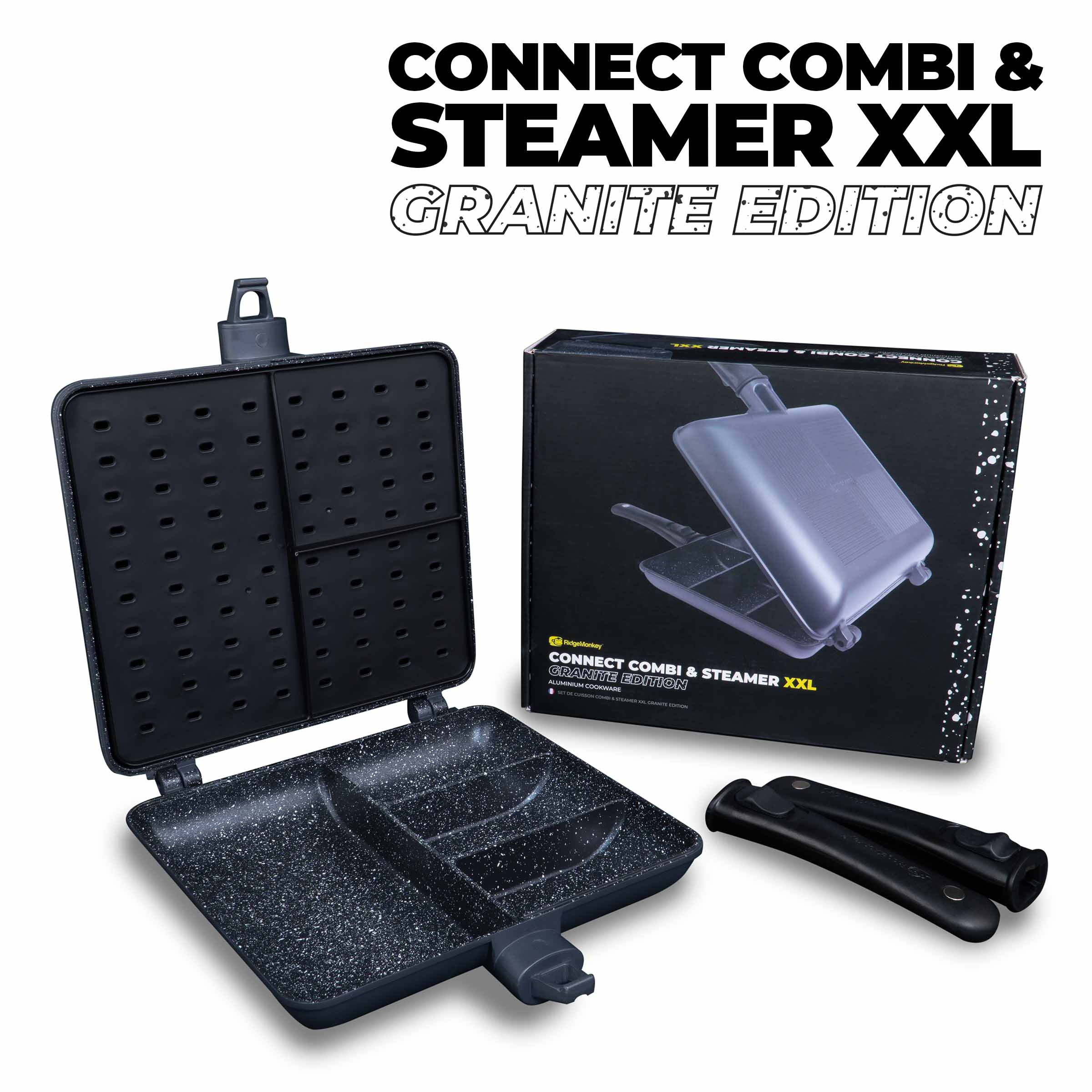 Ridge Monkey Connect Combi & Steamer XXL Granite Edition - большая двойная сковорода с разделителями и съемными ручками с улучшенным антипригарным покрытием под гранит с вкладышем для приготовления на пару в комплекте.