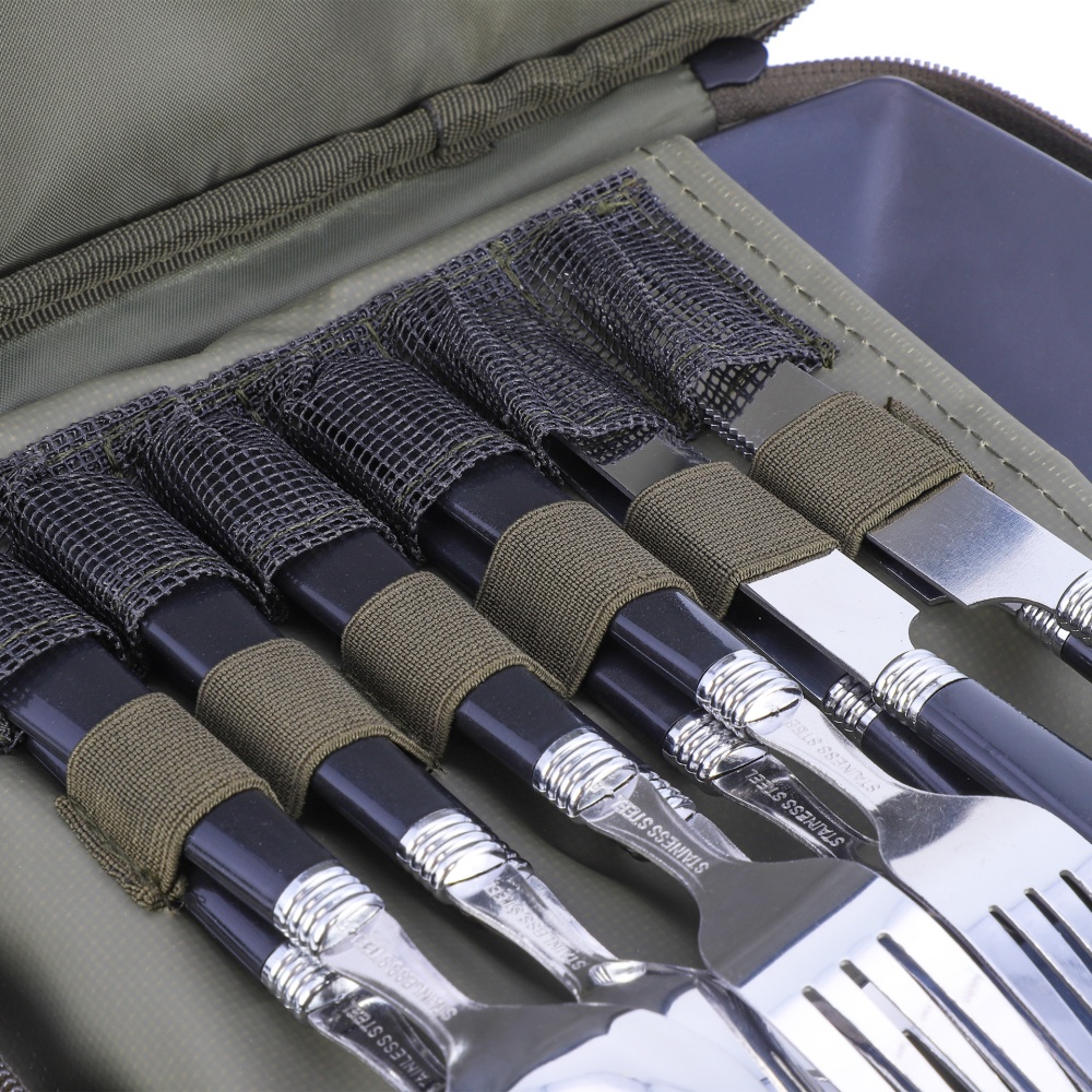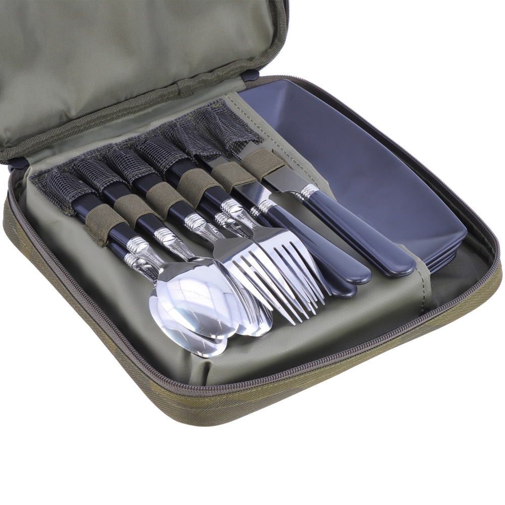 В сумке есть все необходимое для полноценного приема пищи на четырех человек: 4 ложки, 4 вилки и 4 ножа, которые выполнены из высококачественной нержавеющей стали. Кроме того, набор включает 4 тарелки из прочного пластика, который способен выдержать высокие нагрузки и не впитывает запахи. Все приборы компактно помещаются в сумку благодаря продуманному дизайну и креплениям. Сумка Logic Carp 4Man Dining Set – отличный выбор для тех, кто ценит, стиль, качество и функциональность!