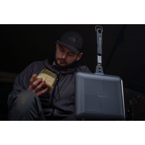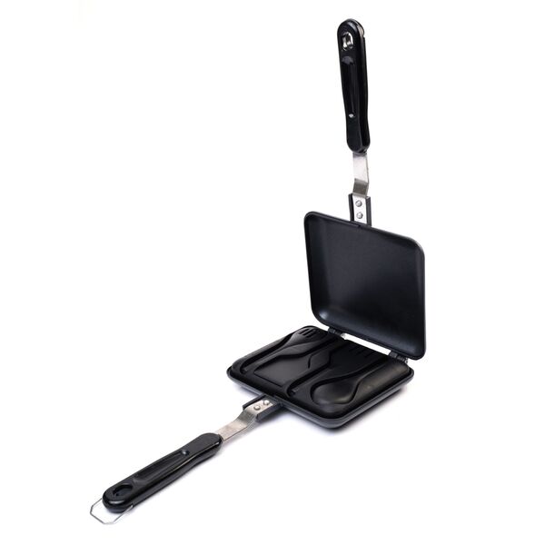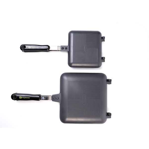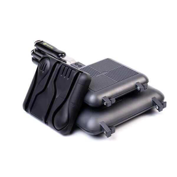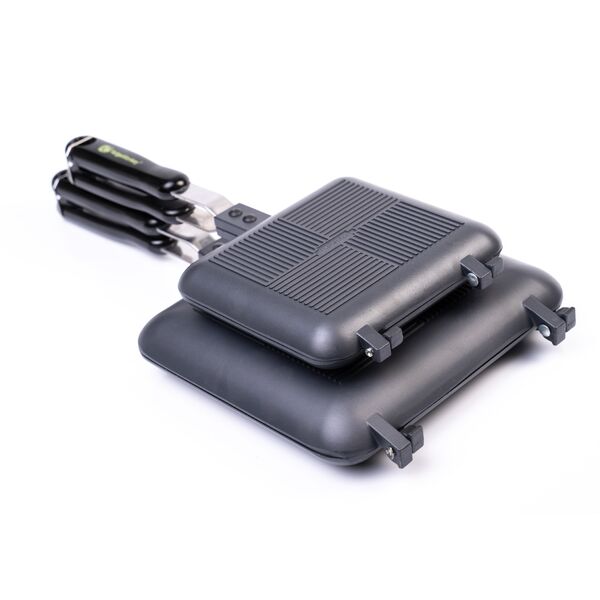 RidgeMonkey 'The Classic' Deep Fill Sandwich Toaster - теперь имеет гладкое черное покрытие, фиксированные, всегда холодные на ощупь рукоятки, склепанные шарниры, а также прилагающийся полноценный набор кухонных инструментов.