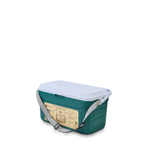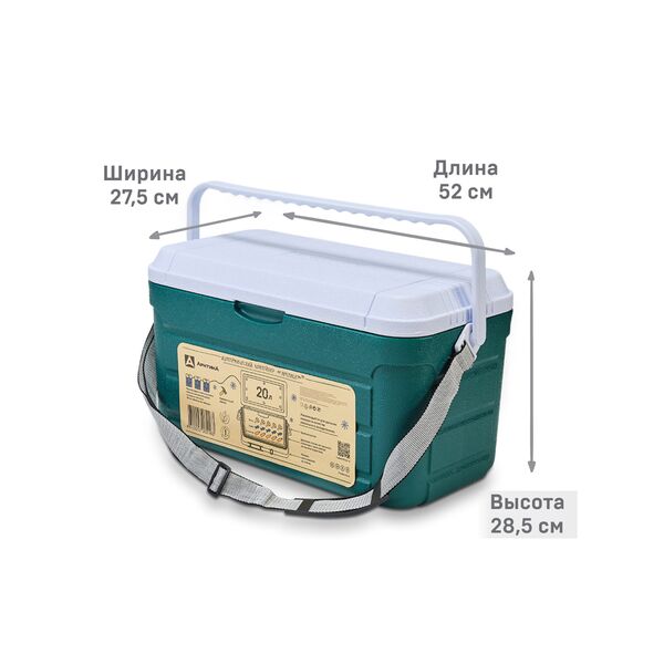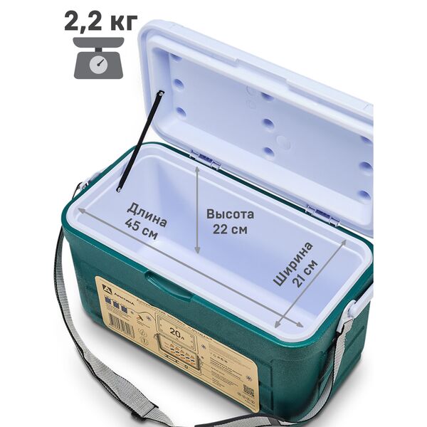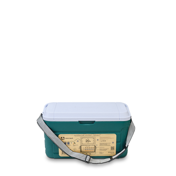 Изотермический контейнер Арктика 20л (Аквамарин) - Термоконтейнер оборудован прочной ручкой и ремнем для переноски на плече. Рекомендуется использовать вместе с аккумуляторами холода серии АТМ из расчета не менее 10% от объема термоконтейнера.