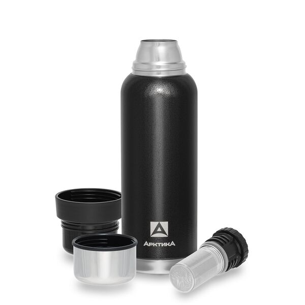 Термос вакуумный для напитков Арктика 1200мл (Черный) - С помощью пробки со специальным ситечком в этом термосе удобно заваривать не только мелколистовой чай, но и полезные для здоровья травяные сборы. В комплекте 2 чашки – для себя и друга. Термос покрыт антивандальной молотковой эмалью и имеет улучшенные показатели удержания тепла, так что готов отправиться с вами в самое дальнее путешествие. Выполнен из долговечной пищевой нержавеющей стали на выбор в зелёном или черном цвете. Благодаря оптимальной конструкции крышка термоса плотно прилегает к горлышку, обеспечивая 100% герметичности. Удобные каналы для налива на пробке позволяют безопасно наливать напиток в крышку-чашку без расплескивания. Гарантия на вакуум – 5 лет.