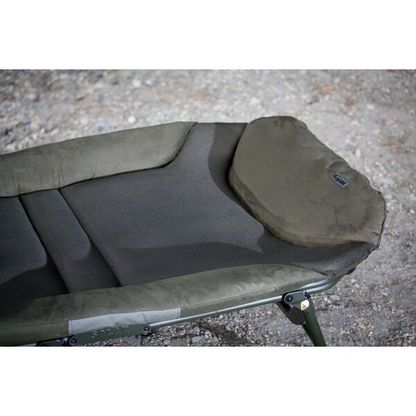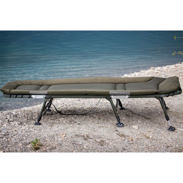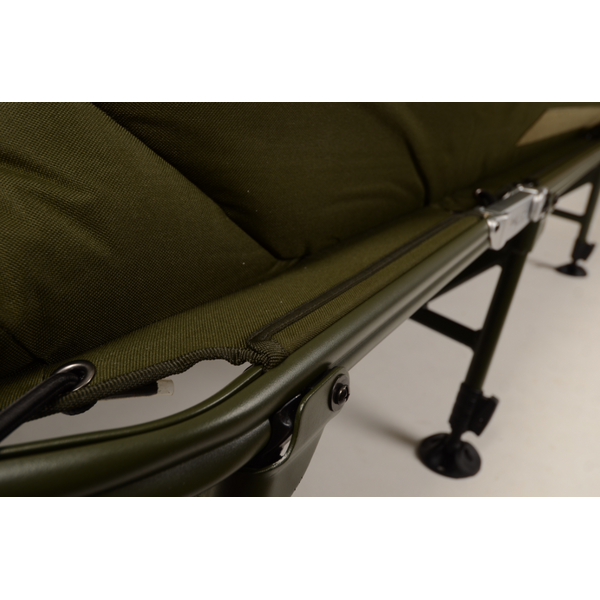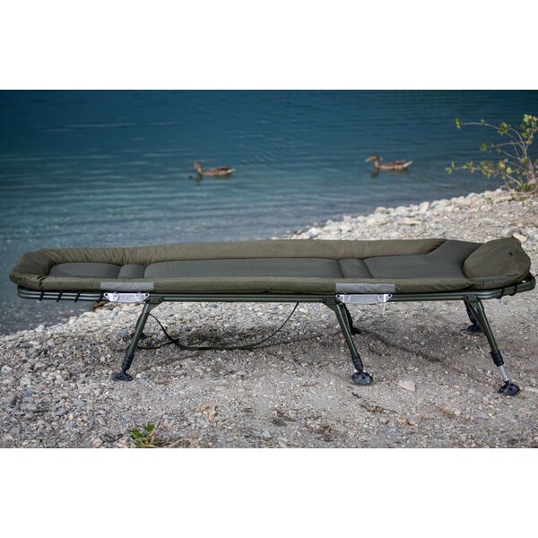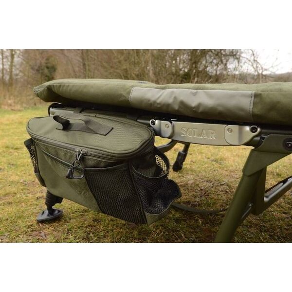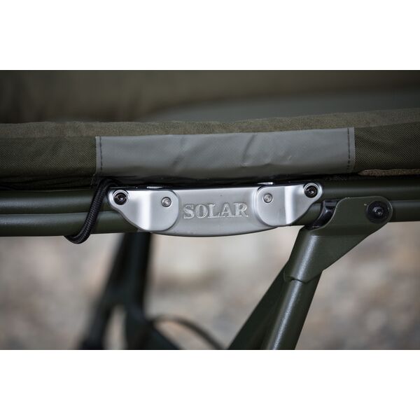 Solar SP C-Tech Bedchair (Includes Detachable Bag) - является флагманом компании Solar. Эта модель изготовлена из высококачественных материалов, включая эксклюзивный материал 3D DuraDore™, матрас с зажатым внутри воздухом, высокопрочный алюминиевый каркас, уникальный пружинный механизм регулировки ног и систему двойных шарниров. Наша непревзойденная уникальная система поддержки поясницы обеспечивает оптимальное «плоское» положение тела во время сна и препятствует «провисанию» матраса, что создает приятное ощущение домашнего комфорта на берегу водоема. Раскладушка комплектуется съемной боковой сумкой, которая крепится сбоку на каркас. В сумке можно хранить все необходимые Вам предметы личного пользования, одежду, а также рыболовные аксессуары. В наличии имеется «широкая» версия раскладушки SP C-TECH, которая шире стандартной модели на 15см. Стандартная раскладушка имеет шарниры зеленого цвета, широкая версия имеет шарниры серебристо-стального цвета.