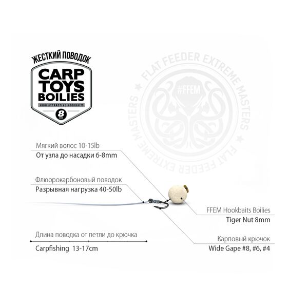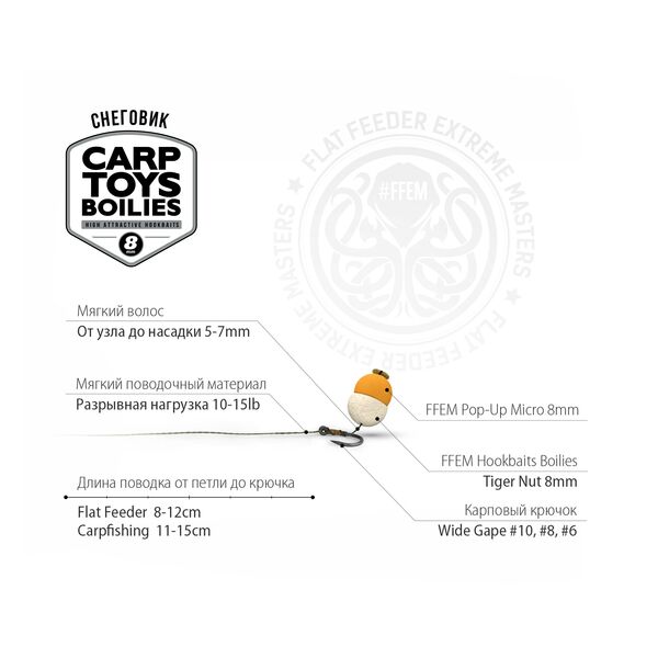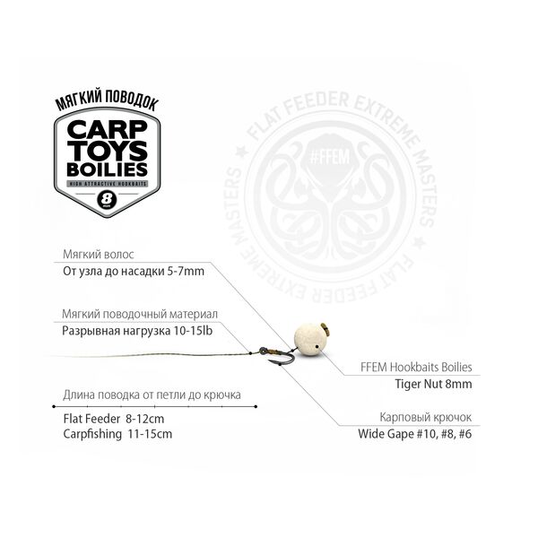 Бойлы насадочные FFEM Baits Hookbaits Boilies Tiger Nut (Тигровый Орех) 8мм - миниатюрные насадочные бойлы спортивной серии с ароматом тигрового ореха, обладающие высокой степенью привлекательности! Бойлы в процессе нахождения на дне выделяют в окружающую среду невероятно привлекательный пищевой сигнал, с мощной вкусо-ароматической нотой. В состав сбалансированного микса входят белки различного происхождения, в том числе и быстро растворимые питательные экстракты. Качественные аромы, и фирменные добавки FFEM Baits придают этим насадочным бойлам особую привлекательность.
