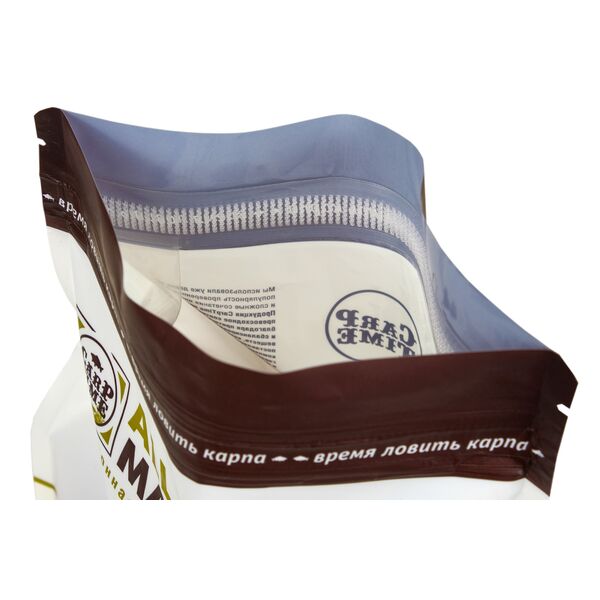 Упаковка для бойлов также подбиралась, исходя из четких требований. Специально для увеличения длительности хранения и сохранности ингредиентов, мы сделали выбор в пользу трехслойной упаковки и системы easy lock. Теперь не нужно целиться мокрыми руками в пазы замка. Пакет легко закрыть наглухо одной рукой. Упаковка имеет прозрачные боковины для того, чтобы еще до покупки были отчетливо видны все лежащие внутри бойлы.