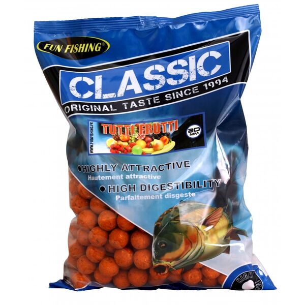 Бойлы варенные Fun Fishing Classic Boilies Tutti Frutti (Тутти-Фрутти) 1кг 20мм - бойлы Classic от компании Fun Fishing с ароматом тутти фрутти. Появившись впервые в 1994 году, бойлы линейки Classic от Fun Fishing отлично ловят и по сей день! Эти легендарные бойлы теперь доступны в 12 запахах и двух размерах (15 и 20 мм). Привлекательность этих бойлов от Fun Fishing достигается благодаря добавлению птичьих кормов, являющихся отличным источником энергии, и молотой обжаренной конопли. С помощью включения в состав крупных грубых частиц (зерен кукурузы) достигается необходимая рыхлость бойлов, способствующая скорой отдачи ароматизатора и подсластителя в воду. Несмотря на кажущуюся рыхлость бойлов, что очень удобно для создания мелкофракционных миксов при помощи круш и дробилок, бойлы линейки Classic обладают хорошей аэродинамикой и выдерживают забросы коброй на дистанции свыше 100 метров.