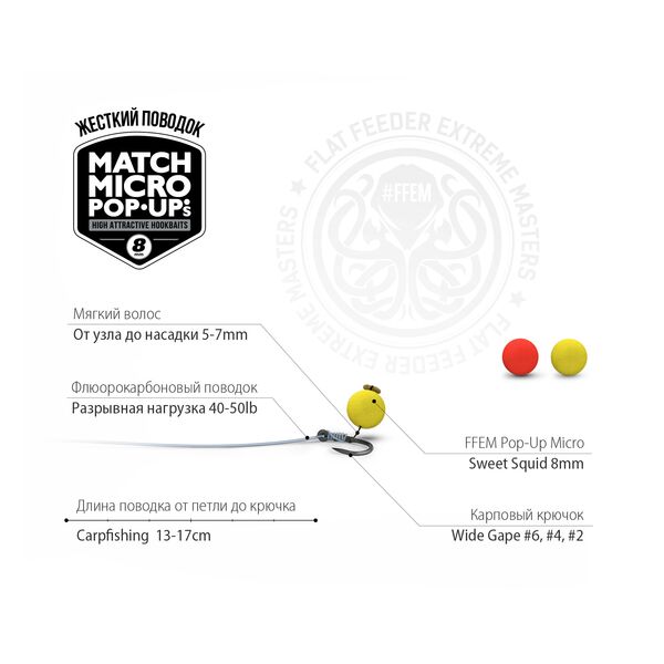 Изысканная комбинация ароматов кальмара и фруктов, делают FFEM Baits Pop-Up Micro Sweet Squid особенной насадкой среди великого множества рабочих бойлов, а добавление пары секретных ингредиентов напрочь лишают рассудка карпов и амуров!
