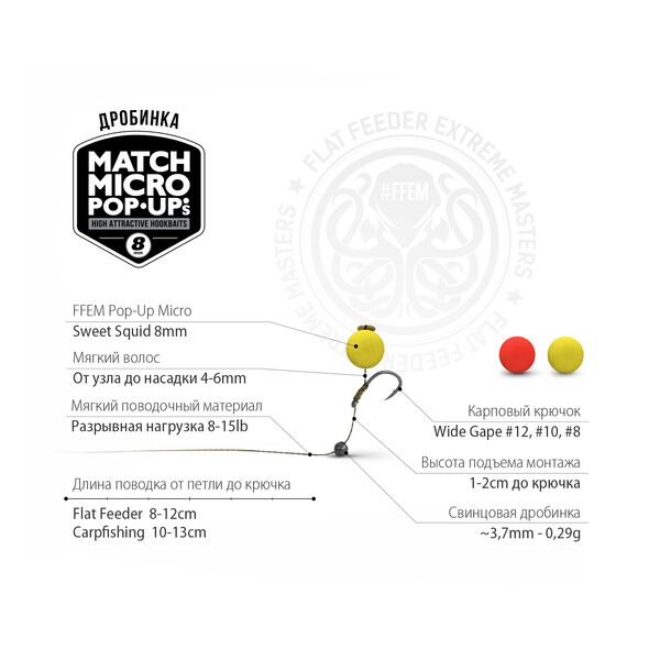 Интенсивный аромат, привлекательный вкусовой сигнал, великолепная плавучесть и плотная, но при этом эластичная структура, являются отличительными особенностями всех плавающих микронасадок FFEM Micro Pop-Up’s 8mm! Думающие рыболовы и поклонники современной рыбалки, использующие миниатюрные насадки, по достоинству оценят эти прекрасные плавающие бойлы, вне зависимости от того, ловят они на Flat Feeder или на классические карповые снасти! Полагаясь на богатый опыт успешных рыбалок и соревнований, компания FFEM Baits сделала микронасадки двухцветными, и теперь у вас есть дополнительный повод как следует поэкспериментировать, и подобрать необходимый цвет идеальной насадки для поимки рыбы своей мечты!
