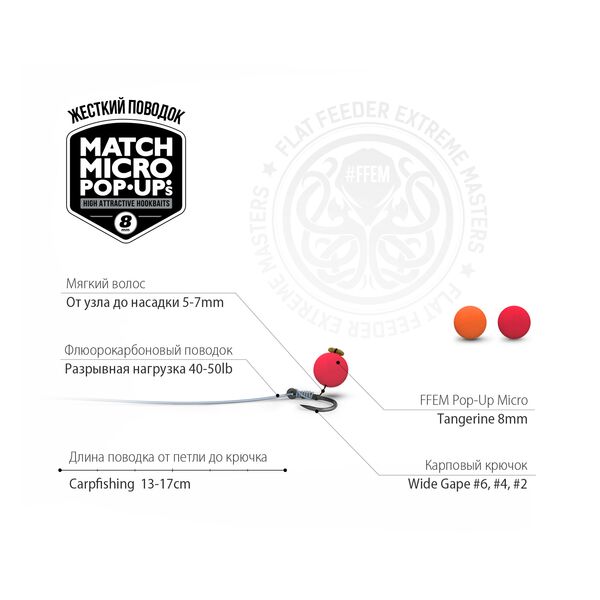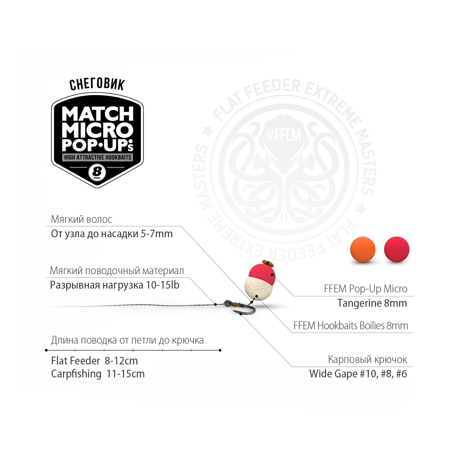 Насыщенный кисло-сладкий аромат мандарина успешно привлекает рыбу с больших расстояний и делает FFEM Baits Pop-Up Micro Tangerine особенной насадкой среди великого множества рабочих бойлов, а наличие в рецепте пары фирменных секретных ингредиентов FFEM Baits напрочь лишают рассудка карпов и амуров!
