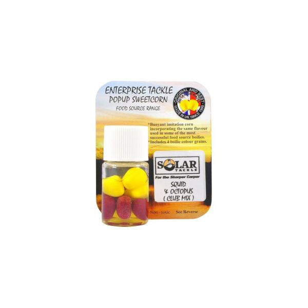 Enterprise Tackle Pop-Up Food Source Solar Squid & Octopus Club Mix - данный вид плавающей кукурузы задипован в аромате от компании Solar - Squid and Octopus (Кальмар Осьминог). Плавающая кукуруза от Enterprise Tackle имеет цвет: желтый/ Mix. В упаковке 8 зерен, в том числе 4 зернышка цвета бойлов данного вида.
