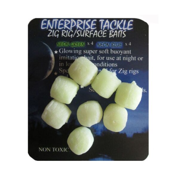 Искусственная плавающая насадка Enterprise Tackle Zig Rig Surface Baits Niteglow Mixed Green\ Blue - эти плавучие насадки успешно применяются в карповой ловле. Искусственная светонакопительная кукуруза, предназначенна для использования в ночное время суток. Заряжается ультрафиолетовым фонариком в течении 30 секунд. Мы рекомендуем подзаряжать ее через 3-4 часа. Цвет - неоново-зеленый.