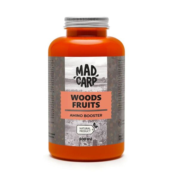 За основу Амино бустер Mad Carp Woods Fruits 500мл - взята натуральная вытяжка из фруктов с добавлением легкоусвояемого молочного белка, аминокислот, необходимых для поддержания здоровья и жизнедеятельности рыбы, качественной ароматике, подсластителей и стимуляторов аппетита, перед которыми карп просто не сможет устоять.