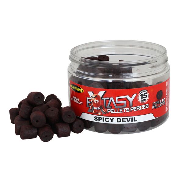 Насадочный пеллетс Fun Fishing Extasy Spicy Devil (Пряный Дьявол) 15мм 250гр - просверленный насадочный пеллетс от компании Fun Fishing с насыщенным ароматом мяса и острых специй. Пеллетс от Fun Fishing насыщен белками и аттрактантами, рецепт гранул очень питателен, легко усваивается и рассеивается в воде как «пищевой» сигнал, которому карпы не могут сопротивляться. Каждая гранула пеллетса имеет отверстие для использования на волосяной оснастке или для изготовления стрингеров с ПВА нитью или лентой.