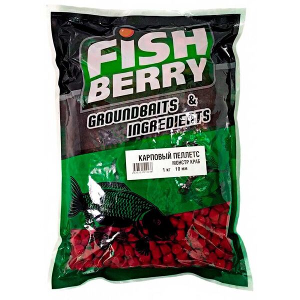 Пеллетс медленно растворимый Fishberry Monster Crab (Монстр Краб) 10мм 1кг – уникальная разработка компании Fishberry - долгорастворимый пеллетс (время растворения до 70 мин в теплой воде) разработан специально для ловли карповых рыб (карпа, сазана, белого амура), а также леща и карася. По своей структуре карповый пеллетс является достаточно клейким, что позволяет, при смачивании водой, использовать его в фидерных кормушках, а также доставлять в точку ловли с помощью рогатки или рукой, слепив небольшой комочек.
