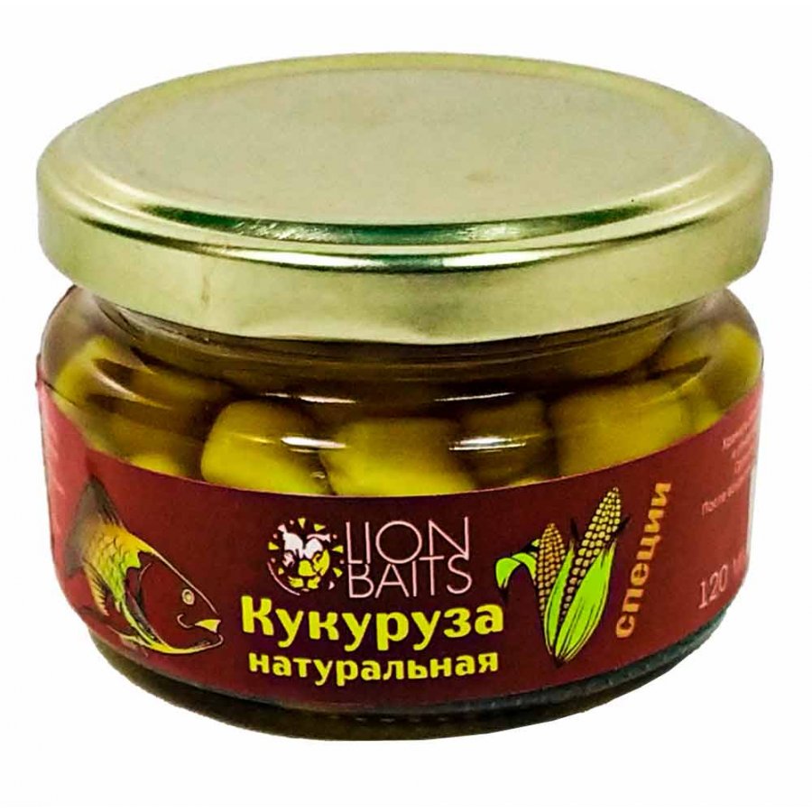 Кукуруза натуральная Lion Baits 120мл - 100% натуральный продукт. Используется в качестве одиночной насадки, так и в комбинировании с другими насадками.