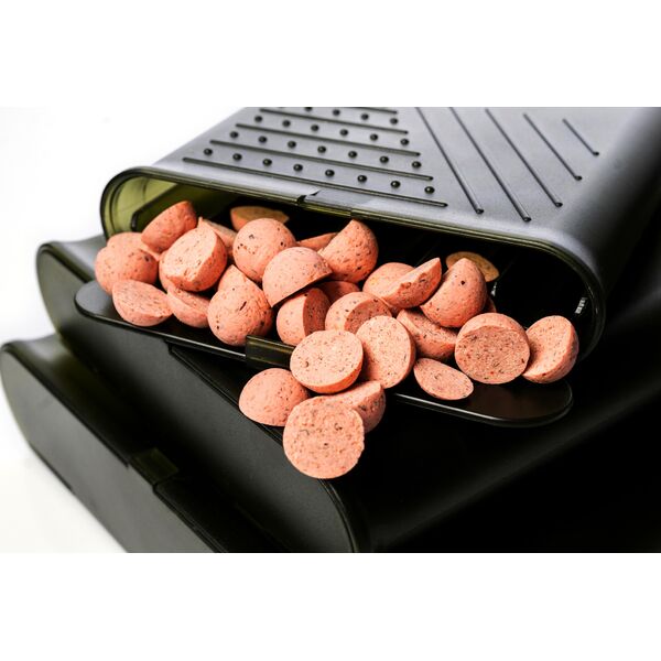 Простой и понятный дизайн и удобство использования – вот та самая формула, которая превратит прикармливания резаными бойлами в настоящее удовольствие. Неправильная форма нарезанных бойлов замедляет их падение сквозь толщу воды, поэтому кусочки бойлов аккуратно ложатся поверх ила или низких водорослей, создавая прикормочный ковер, который существенно отличается от стандартных круглых форм бойлов.