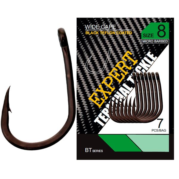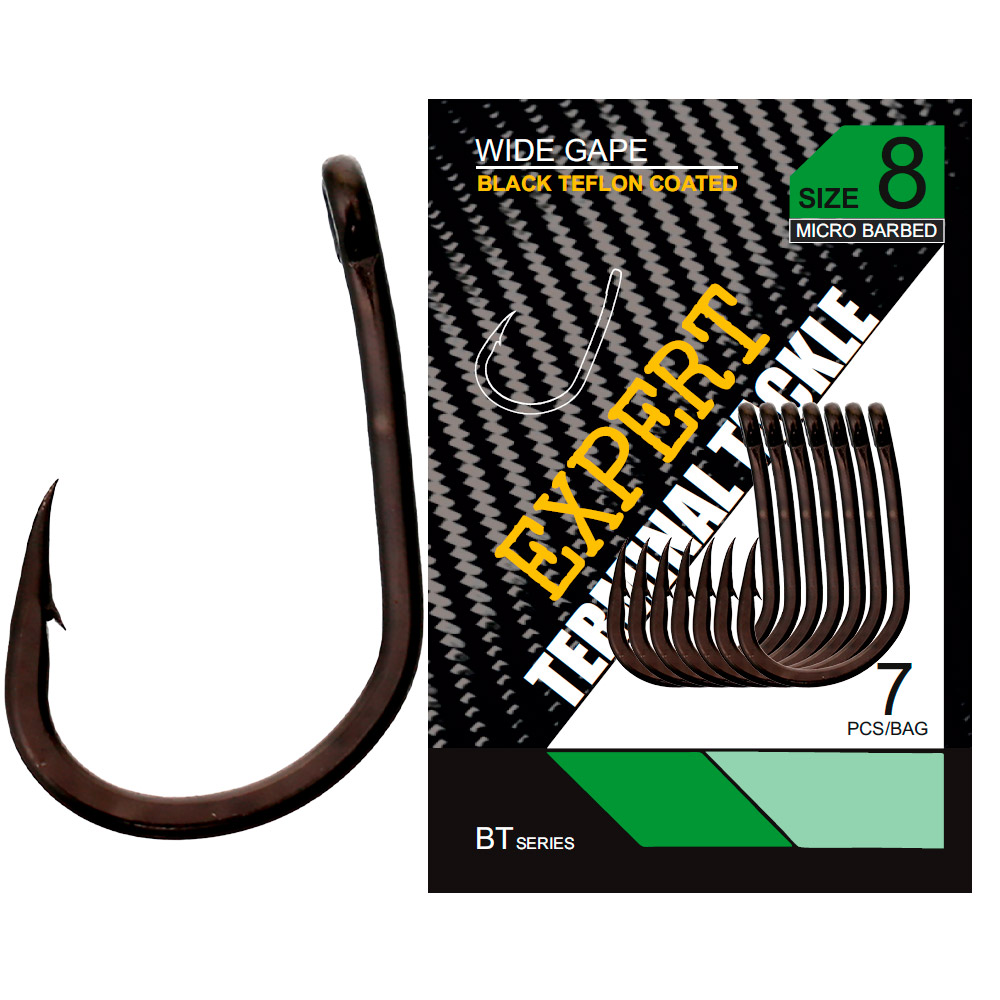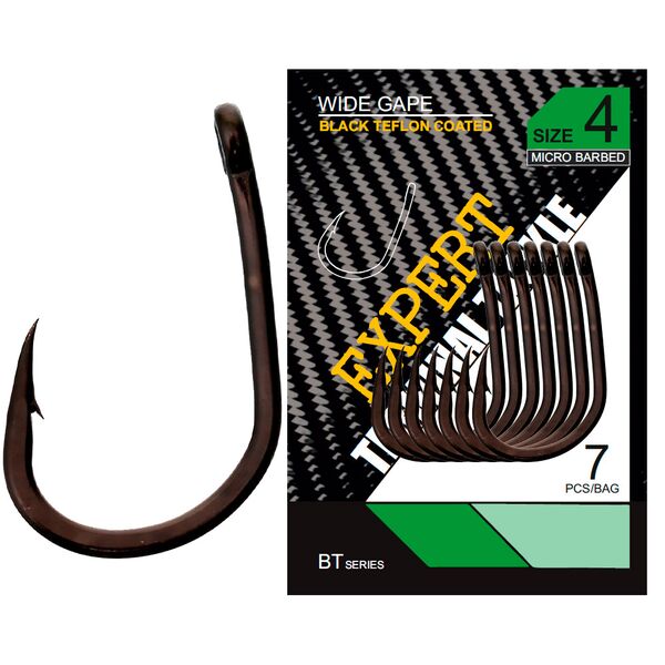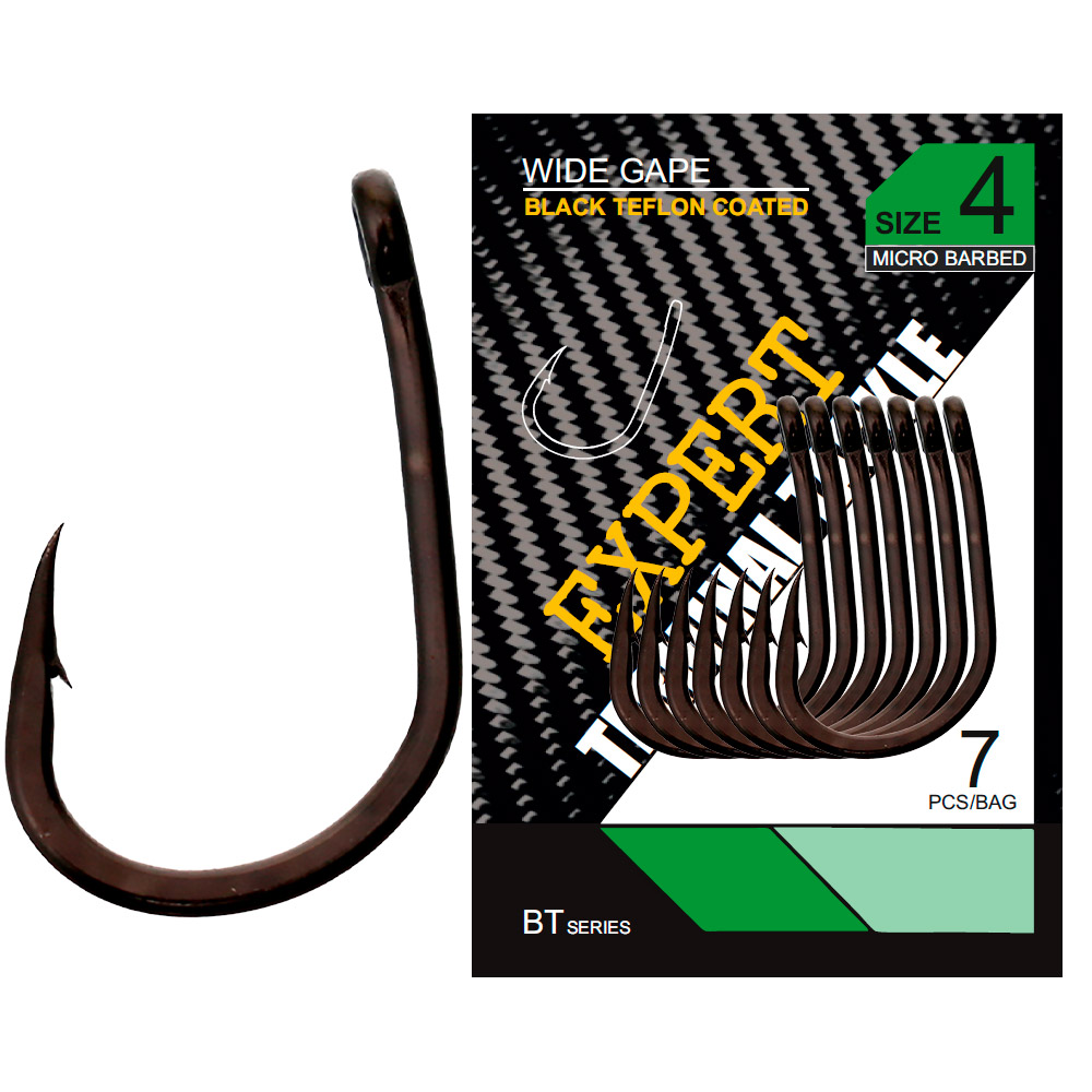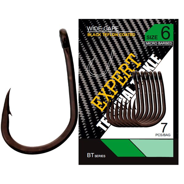 Крючки Carp Pro Black Teflon Wide Gape — крючок классической формы с широким зевом, слегка загнутым внутрь жалом и ушком, что повышает засекаемость посредством его быстрого разворачивания во рту рыбы. Классическая форма прекрасно подходит под любую презентацию насадки — как для тонущих, так и для плавающих любого типа.