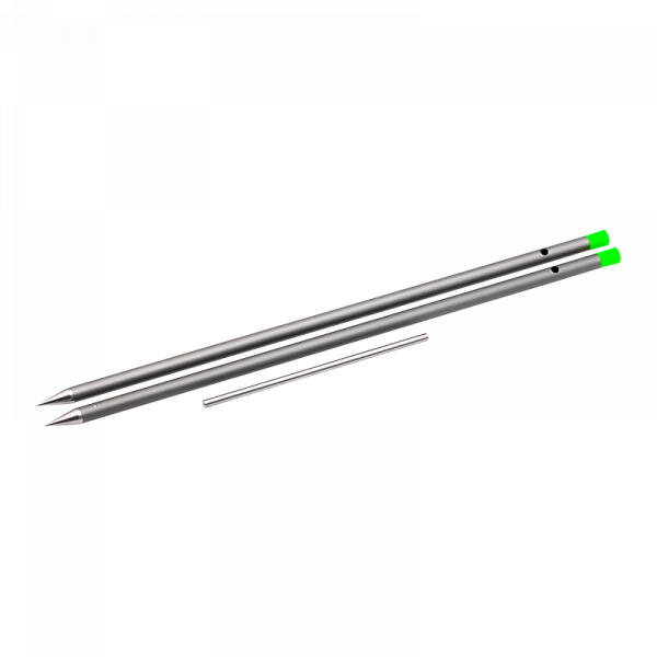 Дистанционные колышки изготовлены из стильного серого анодированного алюминия с ярко-зелеными заглушками наверху для улучшения видимости - особенно при слабом освещении или при использовании их с налобным фонарем в ночное время. Стержень, для удобства хранения, можно спрятать в один из колышков, открутив зелёный колпачок.