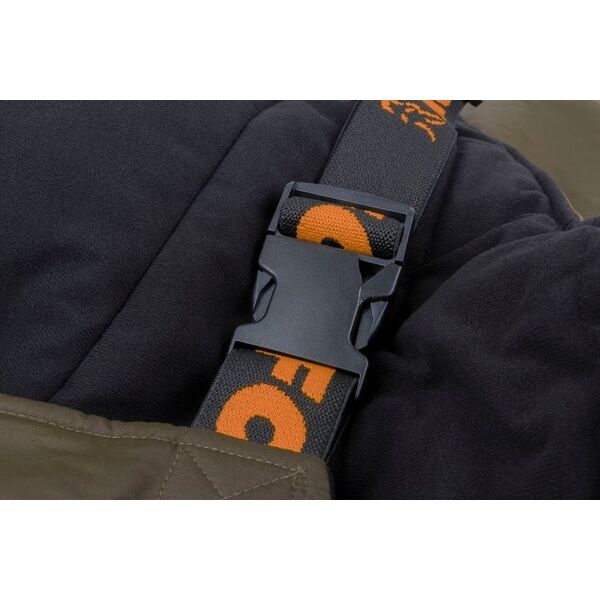 - Комбинезон имеет удобные молнии под высокие ботинки и регулируемые ремни вокруг лодыжки с брендированным резиновым фиксатором.