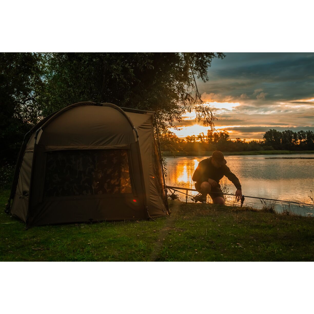 - Четыре продуманных окна из камуфляжной москитной сетки с обеих сторон палатки, а также два окна в задней части
