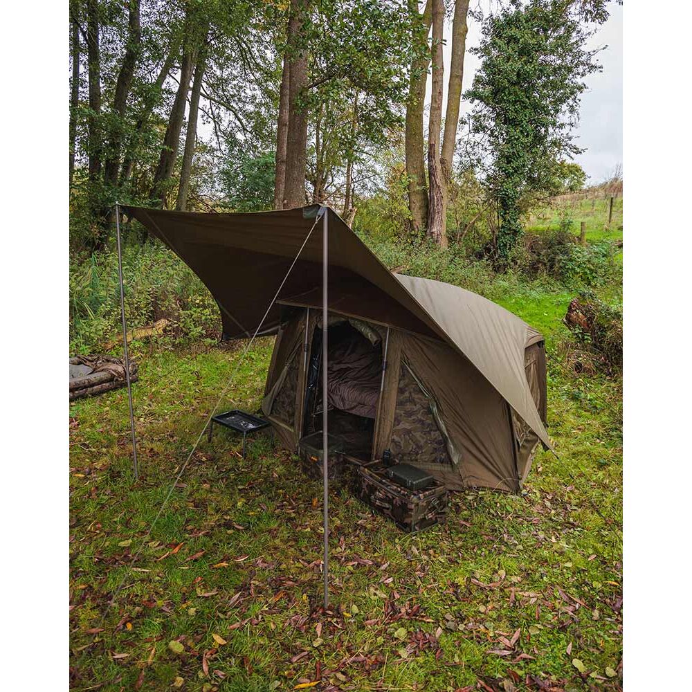 Тент FOX Voyager Tarp - легкие тенты, обеспечивающие различные варианты укрытия. С двумя новыми 4-секционными стойками для различных настроек высоты. Также в комплекте 4 фиксирующих болта для установки дополнительных штормовых стоек.