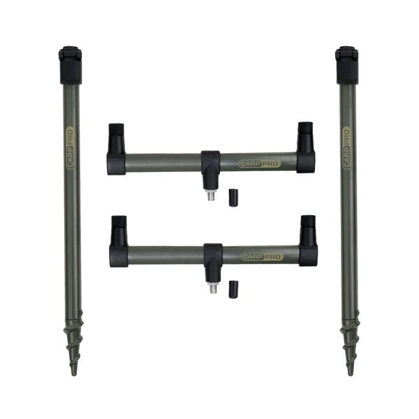 Набор буз-баров и банкстик Carp Pro Buzz & Sticks - компактный набор из двух стоек и двух буз-баров от компании Carp Pro для карповой ловли. Телескопические стойки от Carp Pro оснащены специальными заостренными наконечниками, при помощи которых легко ввинчиваются в грунт. Буз-бары от Carp Pro рассчитаны на два удилища. Имеют контргайки для фиксации электронных сигнализаторов поклевки и держателей комля. Buzz & Sticks Kit In Bag Carp Pro поставляется в удобной непромокаемой сумке на молнии. Содержимое закрепляется внутри сумки при помощи липучек. Сумка оснащена ручками для переноски.