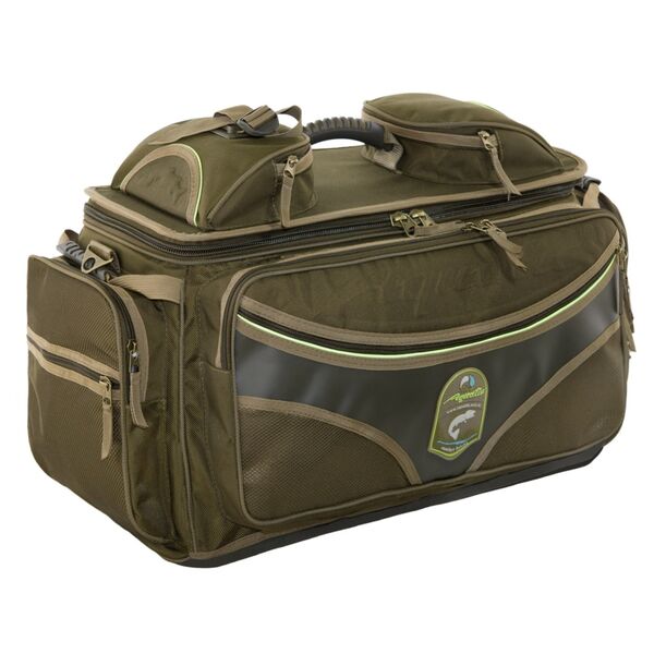 Сумка рыболовная Aquatic объемом 50 л. - с жестким верхом изготавливается из нейлоновых материалов. Сумка Aquatic С-07 прежде всего рассчитана для использования в лодке. Конструкция позволяет сумке (держать форму) даже в не полностью наполненном состоянии, что обеспечивает удобный доступ внутрь. По периметру сумки расположены объемные карманы дублированные карманами на молнии из сетки. Внутри также имеются карманы для мелочей. В дно сумки вставлен пластик и дно изготовлено из ПВХ материала. На сумке имеется светоотражающая отделка, позволяющая с помощью фонаря обнаружить сумку в темное время суток.