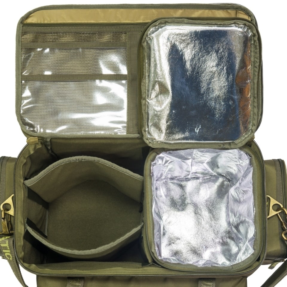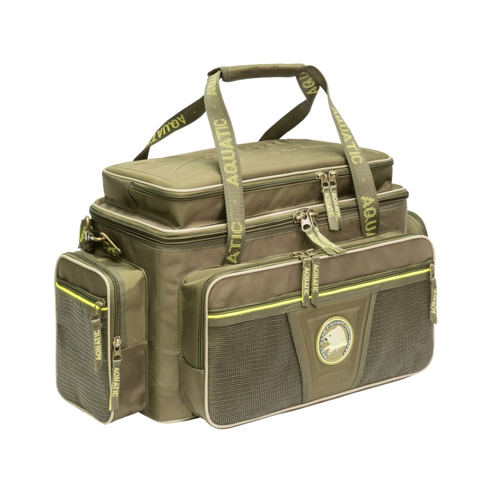 Сумка рыболовная Aquatic С-33 - для фидерной или карповой рыбалки с термосумкой в комплекте. В сумку вставлена дополнительная сумка-термос. Верхний клапан сумки изнутри, оснащен дополнительными карманами на молнии для различных аксессуаров. Внутренность сумки оснащена съемными перемычками. Изготавливается сумка из непромокаемых тканей повышенной прочности, имеет 4 объемных накладных кармана дублированных карманами из сетки. В сумке имеются дополнительные карманы для дополнительных аксессуаров.