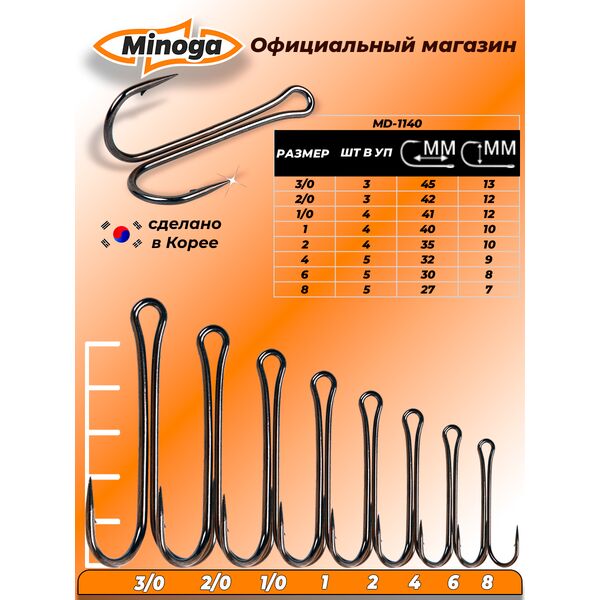 Крючки двойные Minoga MD-1140 — это надежный и качественный двойной крючок, предназначенный для оснащения силиконовых приманок среднего и крупного размера. Особая термообработка обеспечивает крючку невероятную упругость, его жало подвергается двойной химической заточке, поэтому он всегда остается идеально острым и жестким. Темное антикоррозийное покрытие обеспечивает крючку защиту от ржавчины даже в соленой воде, а также великолепно маскирует его, исключая возникновение бликов. Крючок Minoga MD-1140 уверенно выдерживает сравнение с лучшими образцами по прочности и остроте. Крючок изготовлен из специальной стальной проволоки VHI-Carbon, что обеспечивает ему безупречное качество. Отличное качество сочетается в нем с исключительно удачными пропорциями, позволяющими работать даже со съедобными силиконовыми приманками.