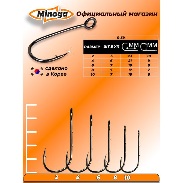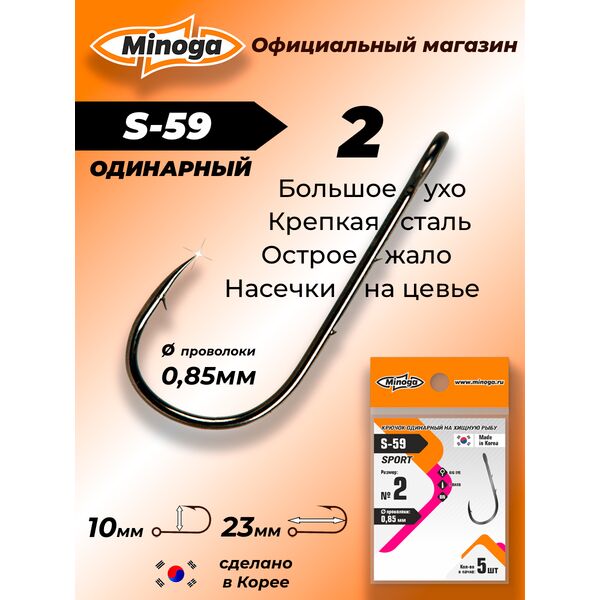 Крючок одинарный Minoga S-59 Sport — это надежный и качественный крючок с крупным ушком, предназначенный для оснащения различных приманок. При производстве крючков данной серии используются высококачественные материалы, что придает крючкам невероятную прочность и долговечность. Кроме того, жало их не тупится и не деформируется. Крючок Minoga S-59 Sport уверенно выдерживает сравнение с лучшими образцами по прочности и остроте. Крупное ушко обеспечивает монтажу свободу движений. Чуточку загнутое внутрь, идеально острое жало гарантирует отменную засекаемость. Еще одно важное преимущество этого крючка – бейтхолдер из двух зазубрин, расположенный на его цевье. Нежные силиконовые приманки держатся на нем надежно, но не повреждается, и не так часто требуют перенасаживания.