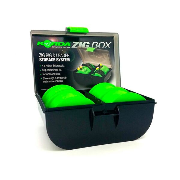 Сама коробка сделана из жесткого ударопрочного пластика, плотно закрывается и подходит для размещения в ней готовых оснасток Korda Ready Zigs, намотанных на бобины. Коробка может вместить восемь таких бобин или комбинацию из бобин двух разных размеров.