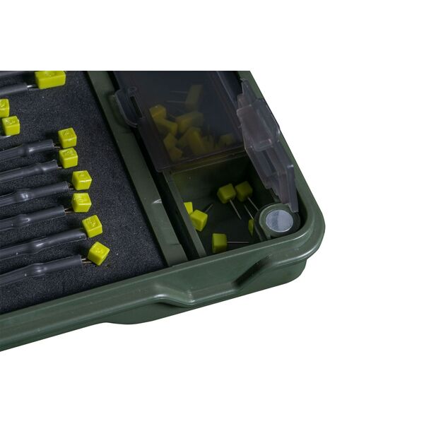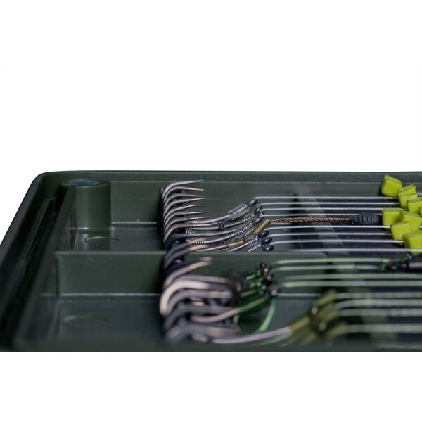 Поводочница имеет четыре отсека для хранения, что позволяет держать под рукой такие предметы, как бусины, стопоры для бойлов или вертлюги. Вы также найдете линейку в верхней части крышки, которая поможет вам каждый раз делать идеальные оснастки.