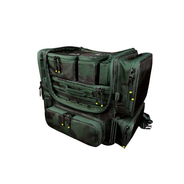 Снаружи наш рюкзак имеет эластичные фиксаторы стоек, а также пять наружных карманов на двойных замках-молниях. В комплектацию рюкзака также входит формованная из ЭВА магнитная столешница, которую можно примагнитить к верхней части рюкзака. Благодаря такой портативной столешнице наш рюкзак идеально подходит для множества рыболовных ситуаций: Вы можете просто иметь желание перемещаться по водоему налегке и иметь импровизированную рабочую станцию для изготовления монтажей и работы с оснастками или же хранить все необходимые небольшие снасти и аксессуары под рукой по ходу сталкинговой ловли.