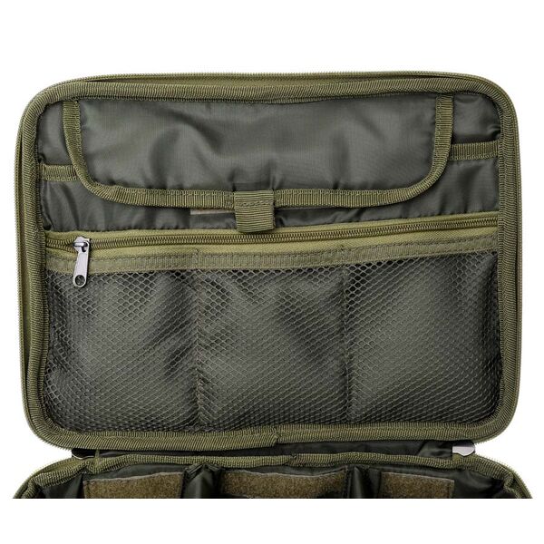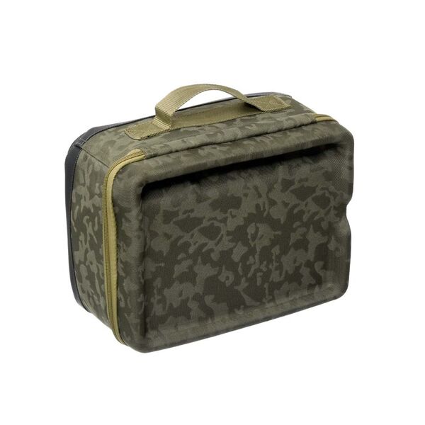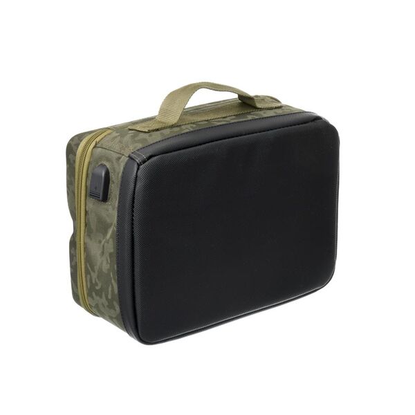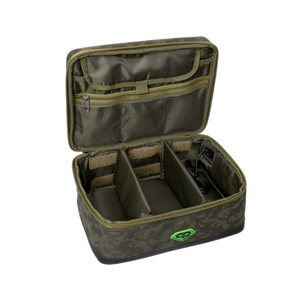 Сумка для гаджетов Carp Pro Diamond Tech Bag – сумка-кейс для карповых гаджетов и аксессуаров. Изготовлена из фирменного влагостойкого камуфлированного материала Oxford 650D. Жесткая крышка изготовлена как столик, на котором удобно пользоваться гаджетами. Крышка имеет бортик, не позволяющий гаджетам соскользнуть, специальное углубление для удобства установки телефона или планшета в вертикальное положение, а также выемку в бортике, которая облегчает зарядку устройств, не позволяя шнуру заламываться, а штеккеру разбивать гнездо для зарядки. Сбоку кейса выведен наружный разъем USB, подключаемый идущим в комплекте кабелем к Power Bank. Внутренняя часть крышки-столика имеет один большой карман с клапаном для планшета и три прошитых сетчатых кармашка на молнии – для хранения шнуров, батареек и прочих небольших аксессуаров. Внутреннее пространство сумки для гаджетов разделено съемными перегородками на три отделения. Мягкие перегородки с креплениями на липучках надежно защищают содержимое, при этом позволяя с легкостью трансформировать размеры отделений под ваши нужды. Днище кейса оснащено твердой вставкой из ПВХ, защищающей его от проникновения влаги. Для удобства транспортировки предусмотрена ручка. Размер -31x23x15 см