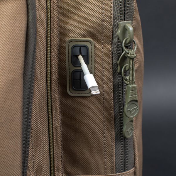 Передний карман достаточно велик, чтобы вместить коробку для снастей Korda, что помогает максимально увеличить пространство в основном отделении. В переднем кармане имеются два внутренних органайзера, которые можно настроить в соответствии с вашими потребностями, а в торцевых карманах имеются литые порты для удобного доступа к зарядным кабелям.