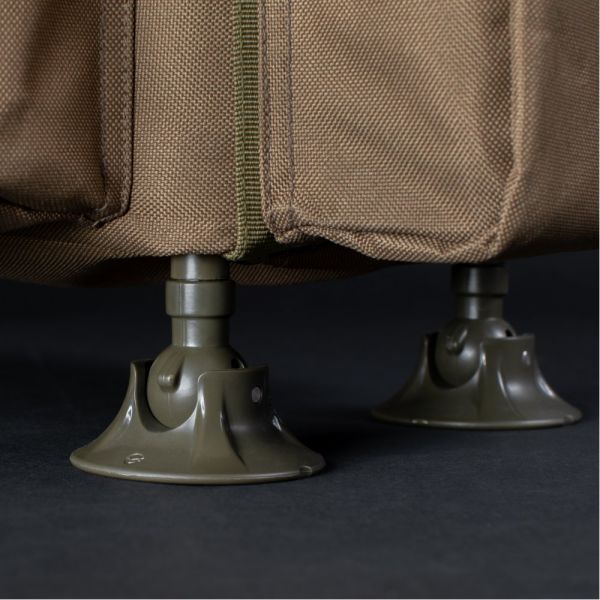 Тележка поддерживается четырьмя самовыравнивающимися грязевыми ножками. Это не только сохраняет устойчивость сумки, но и приподнимает ее основание над полом, что делает ее идеальной для ловли в не совсем идеальных местах плавания.