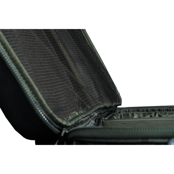 Формованная крышка из ЭВА образует отличное рабочее пространство по типу монтажного столика, поэтому легко может использоваться в качестве устойчивой и надежной столешницы при необходимости. Внутри сумки на обратной стороне крышки имеются два внутренних сетчатых кармана на молнии, а также по одному карману с каждой стороны основного внутреннего отсека.