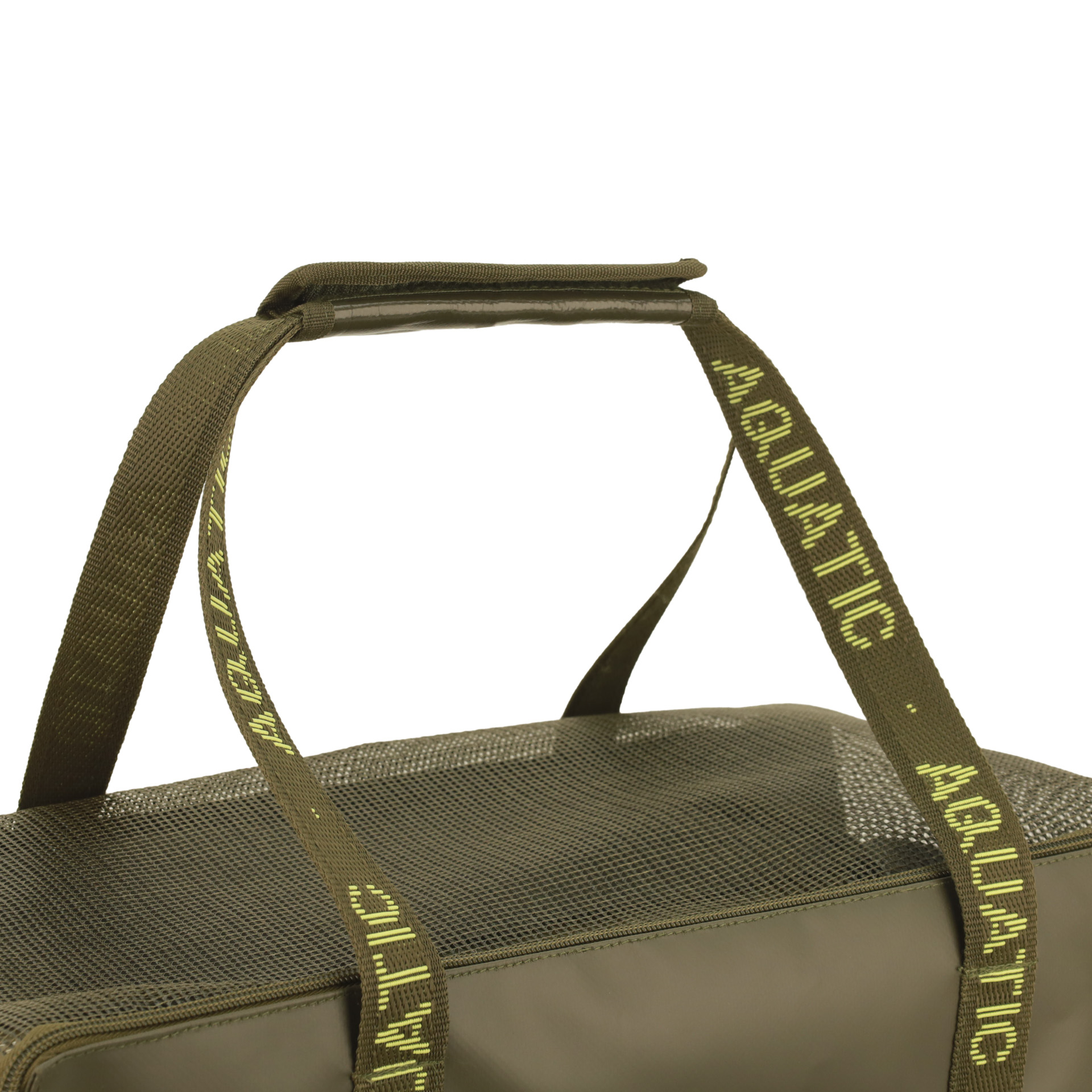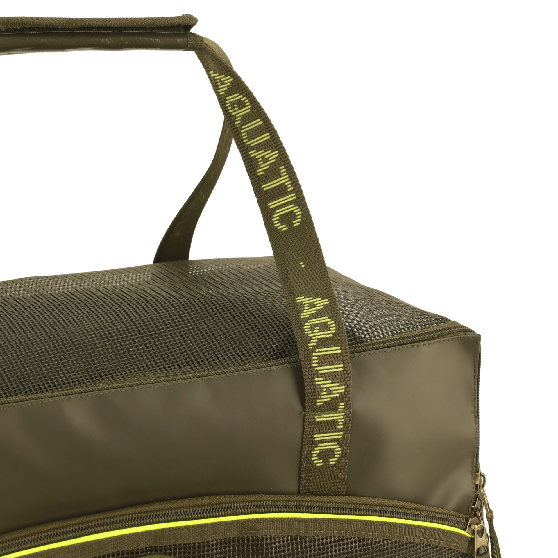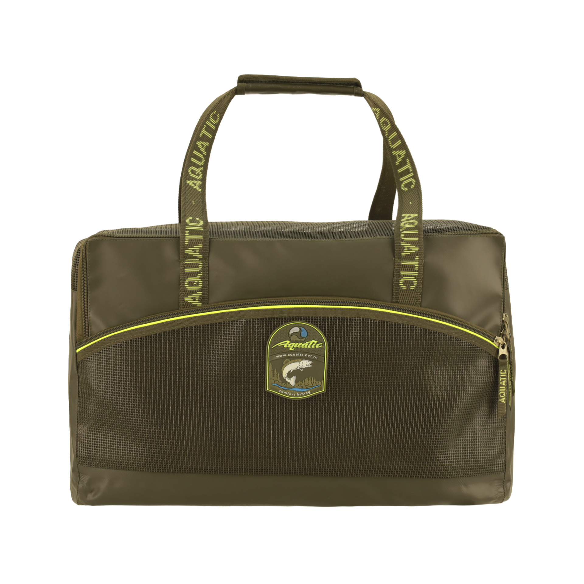 Сумка для вейдерсов и обуви Aquatic С-36 - Герметичная (нижняя часть), сумка с широко открываемым проемом из обрезиненной сетки. Сумка изготавливается из специальной эластичной ПВХ ткани с добавлением каучука плотностью 900гр/м.кв. Ткань имеет повышенные характеристики на истирание, морозостойкость, устойчивость к УФИ по сравнению с обычными тентовыми ПВХ материалами. Прочный материал и проклееные швы позволят использовать ее как сумку для рыбы, сумку для обуви, вейдерсов и т.д. На сумке имеются светоотражающие элементы, что позволяет обнаружить ее в темное время с помощью фонаря. Сумка легко моется, не впитывает запах рыбы.