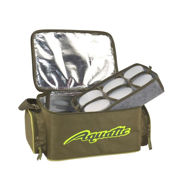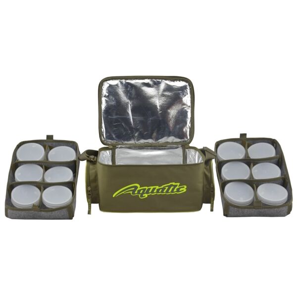 Термо-сумка с 12 банками Aquatic (32х23х21см) - Термо-сумка полностью выполнена из высококачественного износостойкого нейлона и имеет прорезиненное дно, благодаря чему практически не промокает и легко отмывается от загрязнений. Для максимально длительного хранения ваших дипов и насадок весь внутренний объем термо-сумки покрыт технологичным термоизоляционным материалом. Термо-сумка укомплектована 12-ю банками диаметром 89 мм и высотой 60 мм, размещенными в двух специальных съемных отделениях с мягкими перегородками на липучках, которые позволяют подгонять размеры ячеек для банок другого объема. Верхняя крышка на молнии имеет вместительный формованный карман, в котором можно хранить рыболовную коробку, или другие полезные аксессуары. По бокам расположены два объемных кармана на молнии для различных рыболовных принадлежностей. Для удобства транспортировки термо-сумка имеет регулируемый по высоте плечевой ремень из прочной стропы.