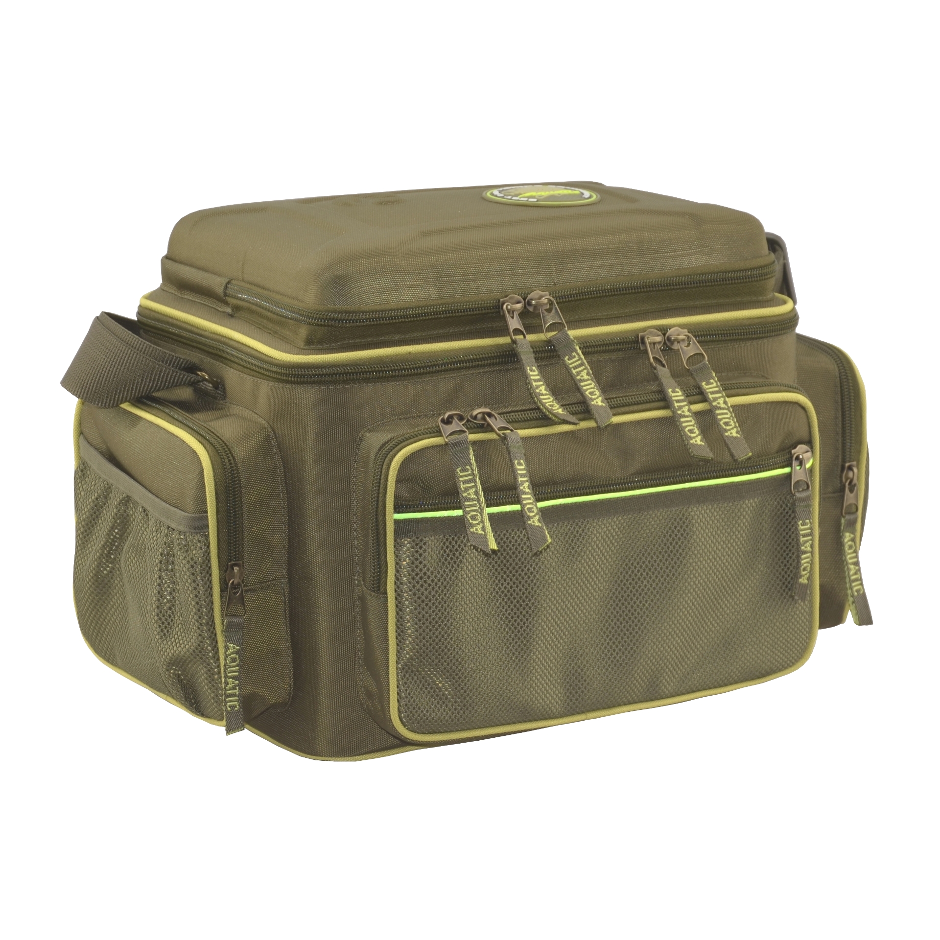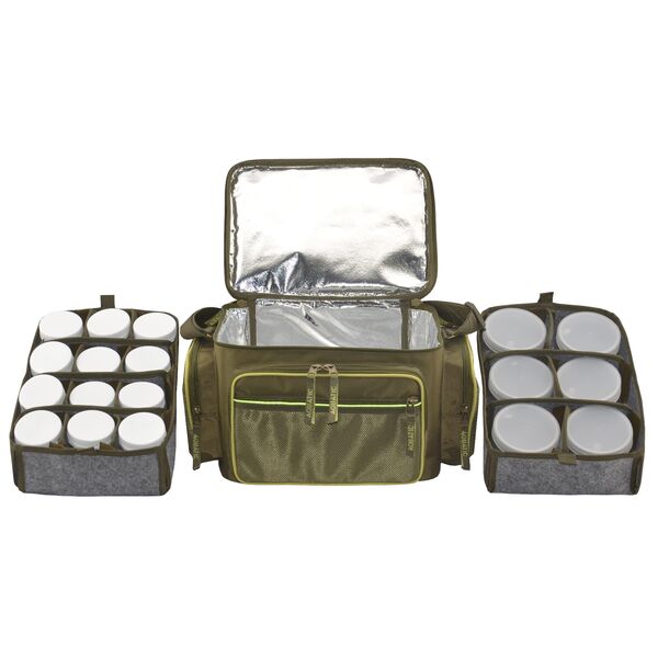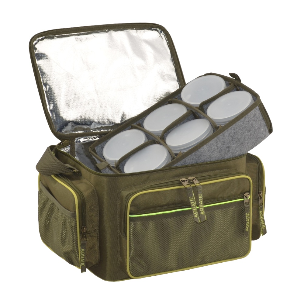 Термо-сумка с 18 банками Aquatic (32х23х27см) - Термо-сумка полностью выполнена из высококачественного износостойкого нейлона и имеет прорезиненное дно, благодаря чему практически не промокает и легко отмывается от загрязнений. Для максимально длительного хранения ваших дипов и насадок весь внутренний объем термо-сумки покрыт технологичным термоизоляционным материалом. Термо-сумка укомплектована 6-ю банками диаметром 89 мм и высотой 80 мм и 12-ю банками диаметром 58 мм и высотой 100 мм, размещенными в двух специальных съемных отделениях с мягкими перегородками на липучках, которые позволяют подгонять размеры ячеек для банок другого объема. Верхняя крышка на молнии имеет вместительный формованный карман, в котором можно хранить рыболовную коробку, или другие полезные аксессуары. Спереди и по бокам расположены три объемных кармана на молнии с накладными карманами из сетки для различных рыболовных принадлежностей.
