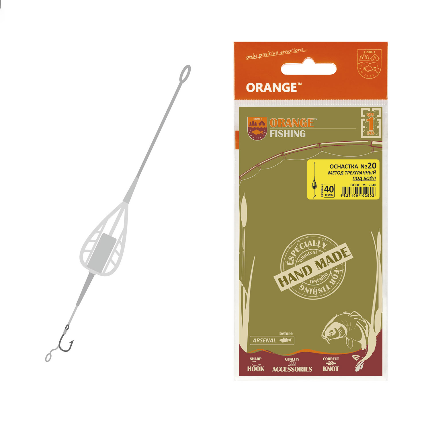 Оснастка карповая ORANGE № 20 Method Feeder – Оснастка для ловли карпа “Метод трехгранный” на 1 крючок. Изготовлена из высококачественных комплектующих: кормушка Orange Method Feeder, карповый поводковый материал Orange Carpx8, лидкор (проклеенный) фирмы Ockert (Germany), крючки Kumho (Korea). Комплектующие и специальные узлы, обеспечивают надежность всей оснастки и гарантируют солидный улов.