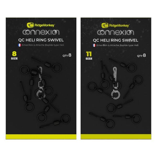 RidgeMonkey Connexion QC Heli Ring Swivel - быстросъемные вертлюги от компании «Ridge Monkey» обеспечивают сверхбыструю замену поводков. Вертлюги оборудованы кольцом с круглым профилем и уникальным выровненным быстросъемным крюком, который минимизирует повреждения силиконовых конусных отбойников.