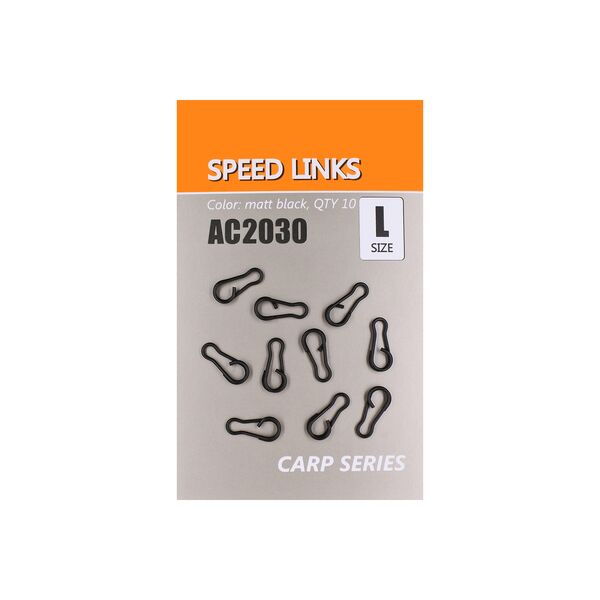 Застежка ORANGE Speed Links Size L (10 шт в уп) – застежка “speed-link” используется в основном в монтажах “вертолет” и “chod-rig”. Специальная конструкция застежки позволяет быстро заменить грузило, кормушку и т.д. Застежки имеют черно-матовое покрытие. Размер - L. В упаковке 10 штук.
